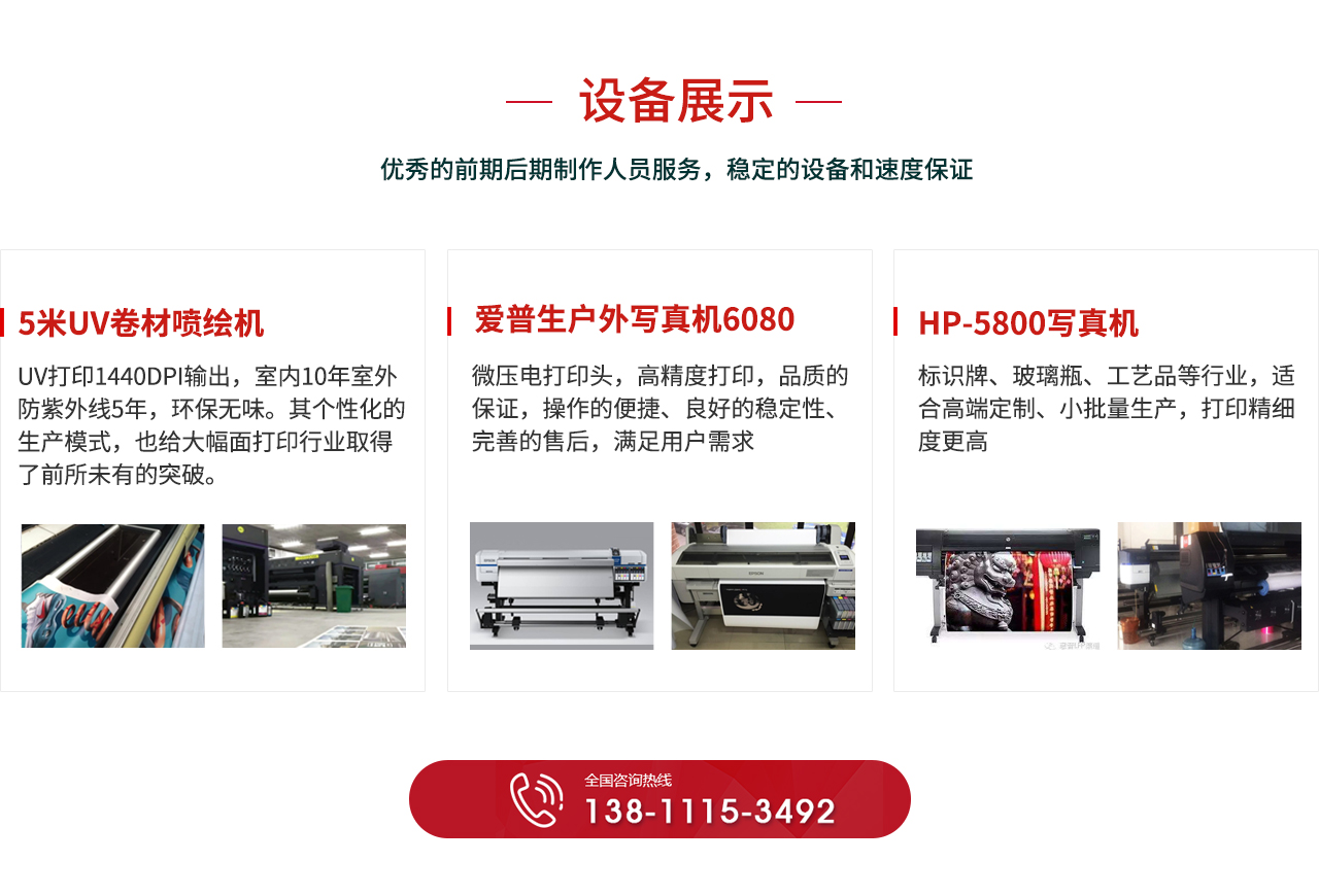 多臺(tái)5M3.2MUV打印設(shè)備,多臺(tái)愛(ài)普生HP打印設(shè)備,進(jìn)口后道設(shè)備,全套多臺(tái)快速加工能力大廠(chǎng)房為批量加工奠定基礎(chǔ)能力的能力,快效的項(xiàng)目執(zhí)行能力、優(yōu)異的團(tuán)隊(duì)協(xié)作能力